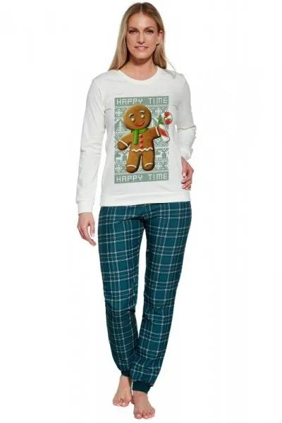 Piżama damska- z wysokiej jakości bawełny- koszulka z długim rękawem- przód koszulki zdobią „bałwanki w świątecznych czapeczkach”- spodnie z długą nogawką, w kratkę- w pasie gumka- nogawki i rękawy zakończone ściągaczem- pakowana w pudełko Skład: 100% bawełna…