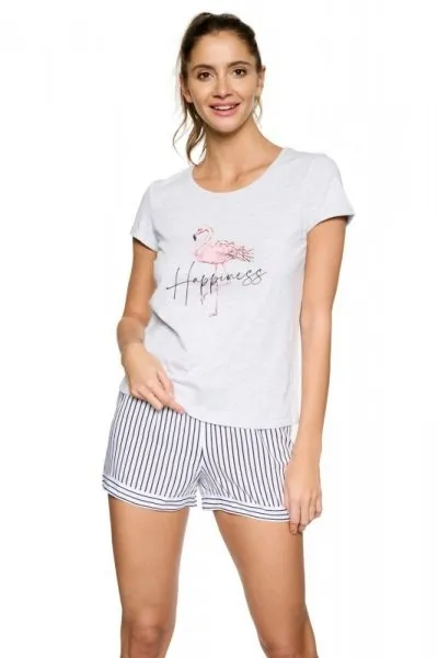 Nietuzinkowo łącząca klasyczną czerń i motywy zwierzęce piżama damska OMENA Plus. Koszulka z miękkiej wiskozy w drobne, dające efekt głębi lamparcie cętki. Ponętny, szeroki dekolt obszyto wyraźnym paskiem czarnej koronki. Ramiączka mocne, zwieńczone cienką lamówką. Między piersiami materiał zebrany w zakładkę i dalej swobodnie rozchodzącą się ku dołowi. Spodnie w całości czarne, długości 3/4, delikatnie zwężane ku dołowi, na końcu nogawek domknięte ażurową materią. Skład surowcowy: 95% wiskoza 5% elastan…