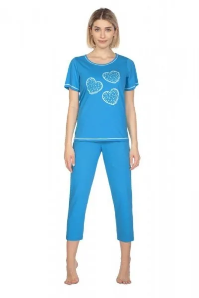 Bawełniana piżama damska- koszulka z krótkim rękawem, przód zdobiony nadrukiem- dekolt okrągły, obszyty lamówką w kolorze spodni- spodnie w kratkę, długość 3/4 Skład: 100% bawełna…