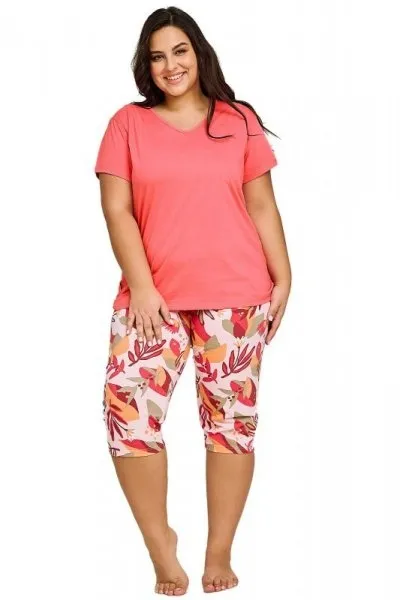 Bawełniana piżama damska- koszulka z krótkim rękawem- z przodu nadruk- spodnie rybaczki, wzór w groszki- w pasie wiązany sznureczek- na biodrach wygodne kieszenie Skład: 100% bawełna…