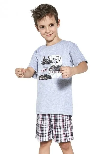 Bawełniana piżama dziecięca z nadrukiem.Bluzka w błękitnym kolorze z nadrukiem zakończona w pasie delikatnym ściągaczem.Długie rękawy zakończone ściągaczami. Dekolt okrągły zakończony lamówką. Spodnie długie w kontrastowym kolorze szarości z nadrukiem.W pasie gumka wszyta w tunelu. Nogawki zakończone obszyciem.Skład materiałowy: 100% bawełna…