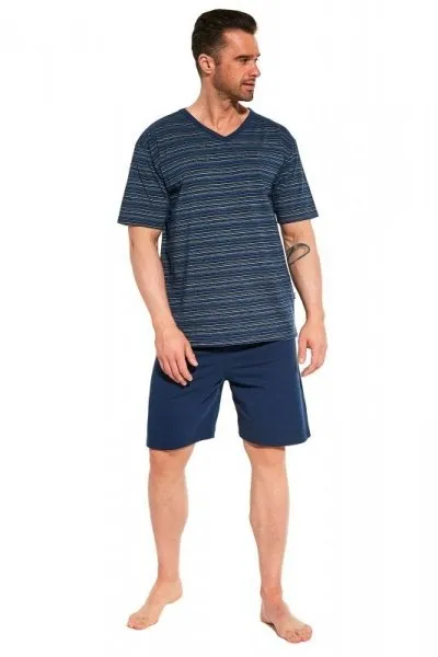 Bawełniana piżama męska- koszulka w paski, z krótkim rękawem- dekolt w kształcie litery V- gładkie szorty Skład: koszulka 80% bawełna, 20% poliester; spodnie 100% bawełna…