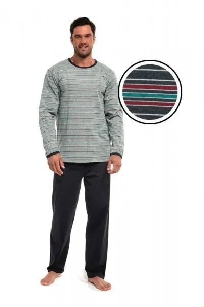 Komfortowa, dwuczęściowa piżama męska z t-shirtem w niebieskim kolorze. Na tkaninie delikatne, jasne paski. Uszyta z miękkiej dzianiny bawełnianej. Propozycja z nowej kolekcji marki Henderson, łączy w sobie sportowy krój i ponadczasowe wzornictwo. Skład: 100% bawełna.RozmiarObwód klatkiObwód bioderM94-98 cm98-102 cmL98-102 cm102-106 cmXL102-106 cm106-110 cmXXL106-110 cm110-114 cm …