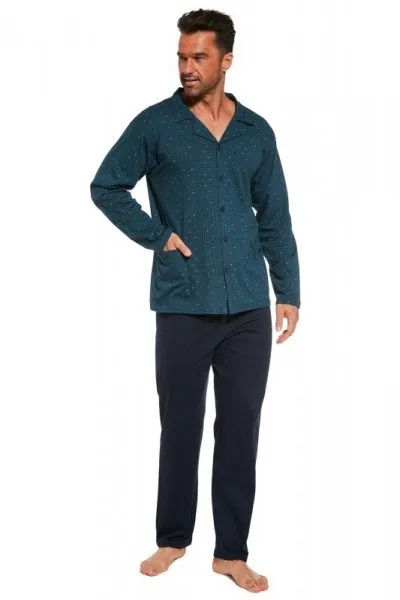 Piżama męska- koszulka z długim rękawem- dekolt okrągły- zapinany na guziki- po boku ozdobny napis- spodnie z długą nogawką- w kratę- w pasie troczek do regulacji wiązaniaSkład: 100% bawełna…
