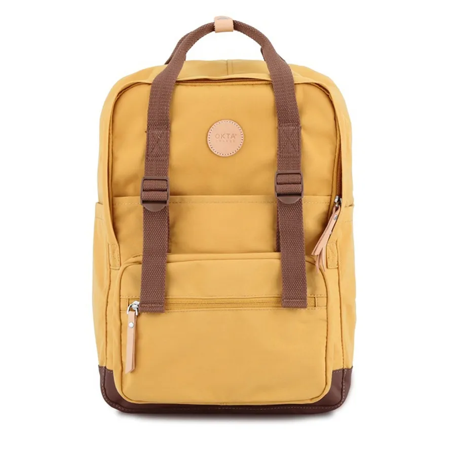 Pomarańczowo-brązowy plecak wykonany z ekologicznej wodoodpornej tkaniny poliestrowej. Pojemny i funkcjonalny. Plecak wyposażony w kieszeń na urządzenie przenośne. Mieści laptopa do 15,6″. Zamykany suwakiem.