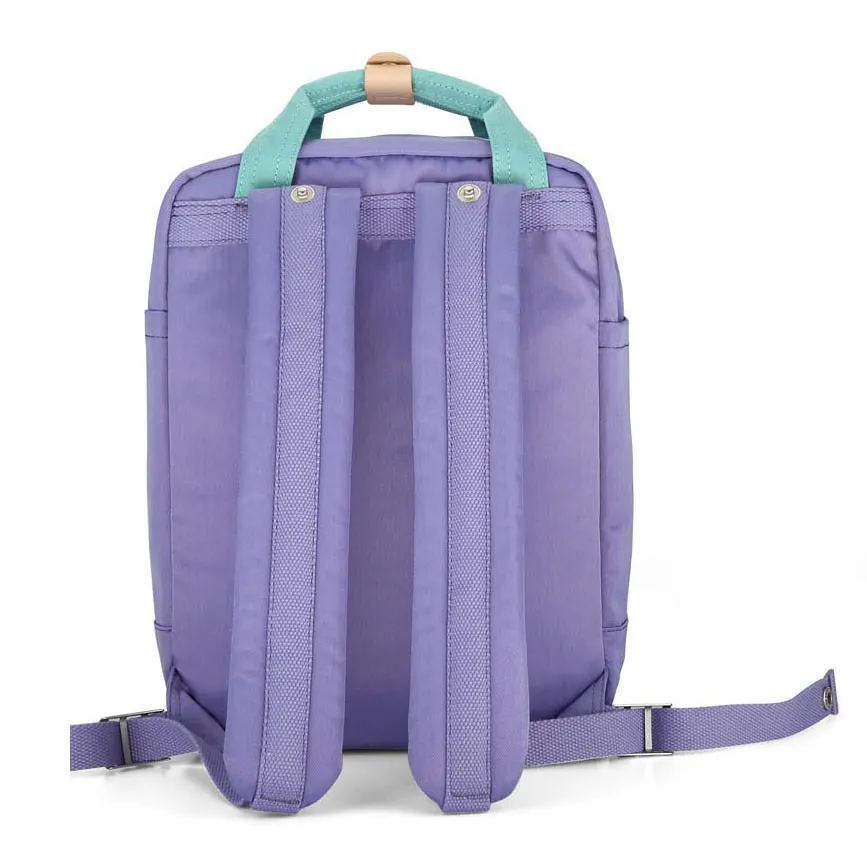 Fioletowo-miętowy plecak wykonany z wodoodpornego nylonu. Plecak mieści format A4. W głównej komorze zapinanej na podwójny zamek błyskawiczny wyszyto aż 7 praktycznych kieszeni. Plecak zawieszony na regulowanych szelkach.