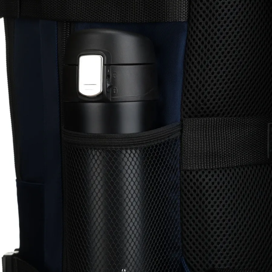 Plecak wykonany z poliestru w czarnym kolorze. Jego wymiary są zgodne z limitem darmowego bagażu w Ryanair i Wizzair. Posiada pasy zabezpieczające bagaż wewnątrz i uchwyt do zamocowania na walizce. Zawieszony na oddychających szelkach.