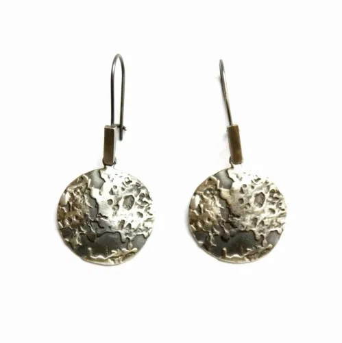Kolczyki wykonane ze srebra próby 925. Wykończone oksydą w kolorze brązowo- złotym. Szerokość 1,3 cm. Waga: 3,2 gr. Tutaj wersja kolczyków zawieszonych na kosteczkach. Subtelne i jednocześnie intrygujące. Nr katalogowy :K39KBR