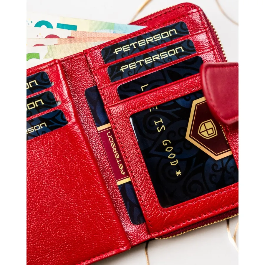 Klasyczny, czerwony portfel damski ze skóry naturalnej i ekologicznej zamykany na suwak i zatrzask PTN PS115-HNL Peterson
