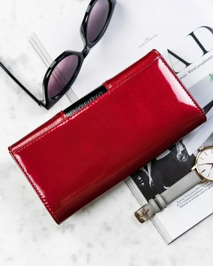 Uszyty z wysokogatunkowej skóry naturalnej z wierzchu pokrytej lakierem. Portfel poziomy zamykany klapką na zatrzask. Model zaprojektowano niezwykle intuicyjnie i funkcjonalnie. Pomieścisz w nim pokaźne ilości kart, dokumentów oraz gotówki.