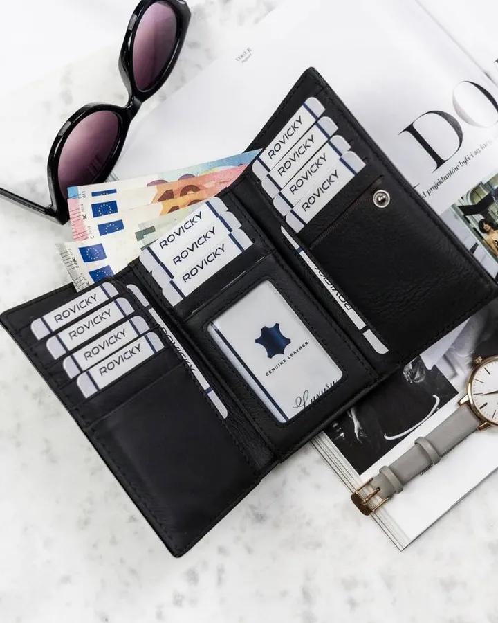 Uszyty z wysokogatunkowej skóry naturalnej z wierzchu pokrytej lakierem. Portfel poziomy zamykany klapką na zatrzask. Model zaprojektowano niezwykle intuicyjnie i funkcjonalnie. Pomieścisz w nim pokaźne ilości kart, dokumentów oraz gotówki.