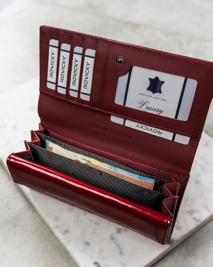 Uszyty z wysokogatunkowej skóry naturalnej z wierzchu pokrytej lakierem. Portfel poziomy zamykany klapką na zatrzask. Model zaprojektowano niezwykle intuicyjnie i funkcjonalnie. Pomieścisz w nim pokaźne ilości kart, dokumentów oraz gotówki.