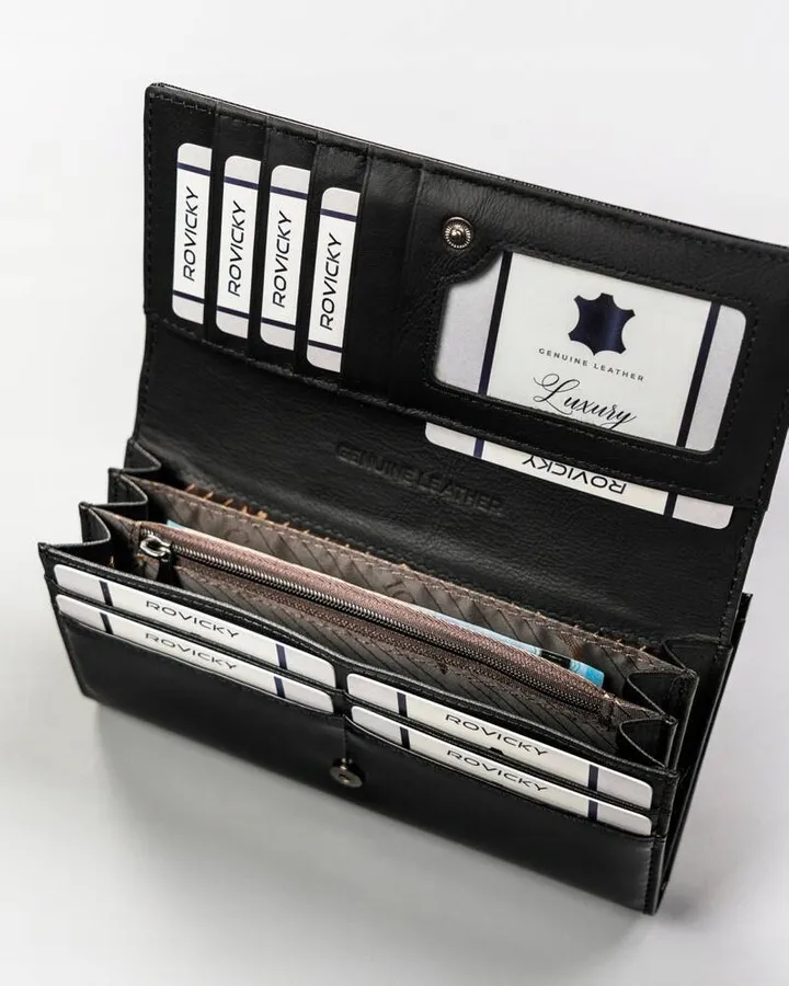 Uszyty z wysokogatunkowej skóry naturalnej z wierzchu pokrytej lakierem. Portfel zamykany klapką na zatrzask. Front zdobi logo marki. Model zaprojektowano intuicyjnie i funkcjonalnie. Pomieścisz w nim pokaźne ilości kart, dokumentów oraz gotówki.