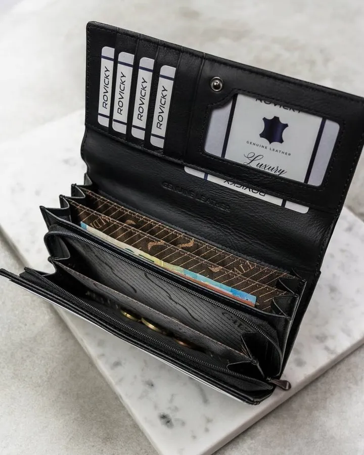 Uszyty z wysokogatunkowej skóry naturalnej bydlęcej. Skóra portfela po stronie zewnętrznej jest lakierowana. Zamykany klapką na zatrzask. Ten model pomieści pokaźne ilości kart, dokumentów oraz gotówki.