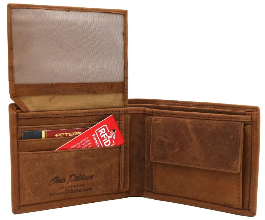 Portfel jest odszyty z najwyższej jakości skóry naturalnej i ekologicznej. Środek portfela jest wykończony skórą naturalną, zaś strona zewnętrzna to gładka skóra ekologiczna. Wyposażony w system RFID.