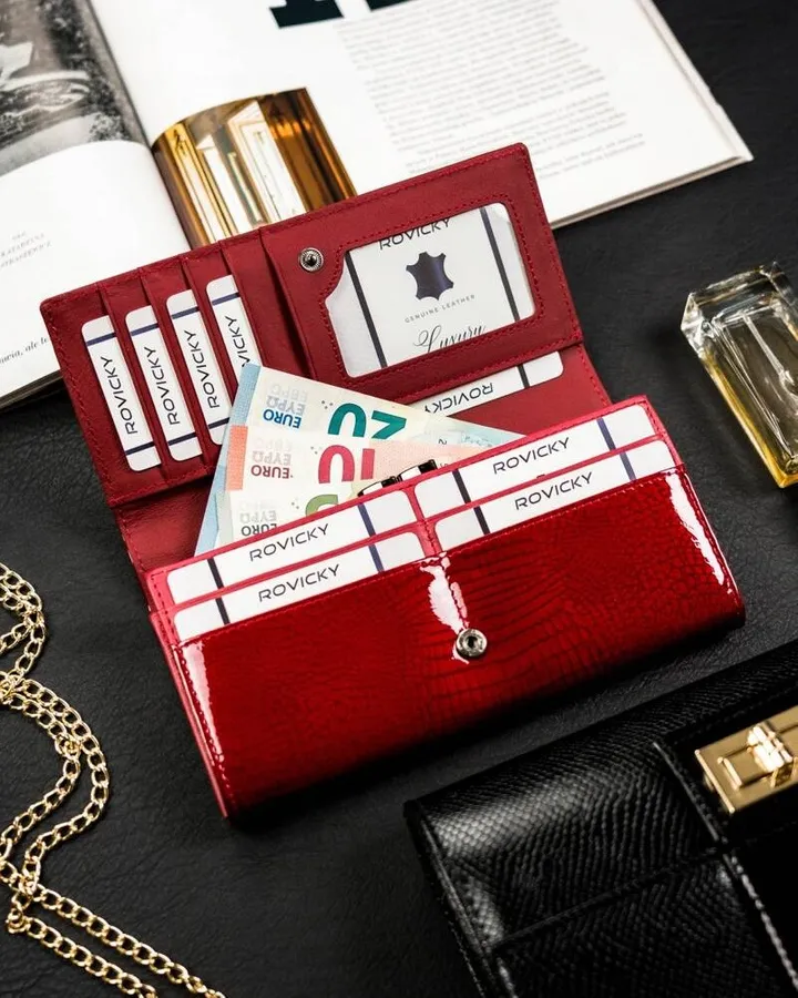 Duży, poziomy portfel damski zamykany klapką z zatrzaskiem. Środek portfela wykończony jest skórą naturalną o gładkiej fakturze, zaś strona zewnętrzna to błyszcząca eko skóra z motywem wężowej skóry. Kieszeń na bilon zamykana suwakiem.