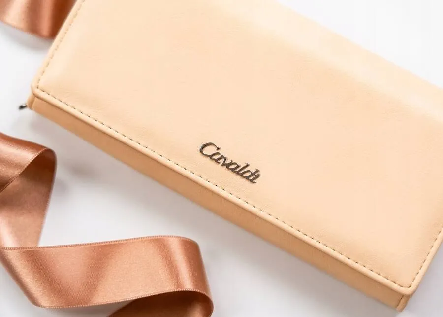 Portfel odszyty bardzo trwale z doskonałej jakości skóry ekologicznej saffiano. Model w orientacji pionowej, dwusekcyjny, zamykany na zatrzask oraz suwak. Front ozdobiony logo marki. Portfel wyposażony w system STOP RFID.