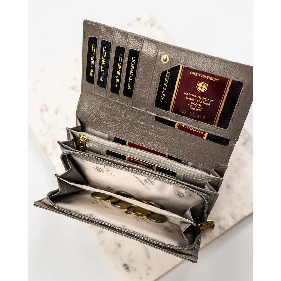 Srebrny portfel wykonany z lakierowanej skóry naturalnej. Posiada 17 przegródek na karty, 4 miejsca na większe dokumenty i 2 przegrody na bilon i banknoty. Zamek i okucia w eleganckim, złotym wykończeniu. Mieści dowód rejestracyjny.