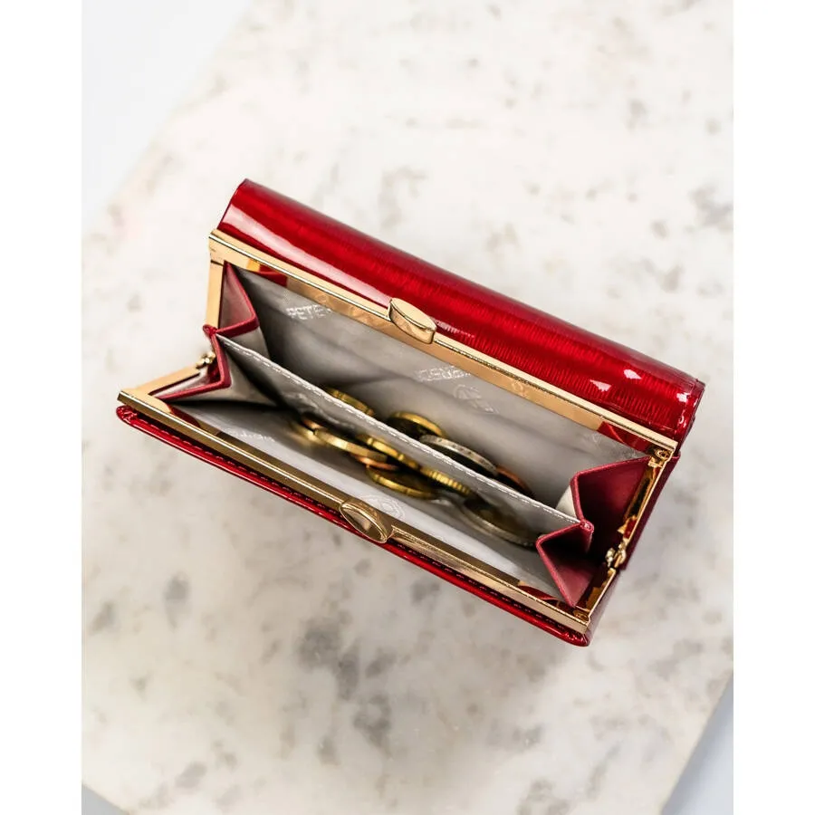 Duży portfel damski na zatrzask. Wykonany z wysokojakościowej skory naturalnej o lakierowanym wykończeniu. Portfel praktyczny i bezpieczny dzięki zabezpieczeniu RFID. Wyposażony w zewnętrzną portmonetkę zamykaną zatrzaskiem.