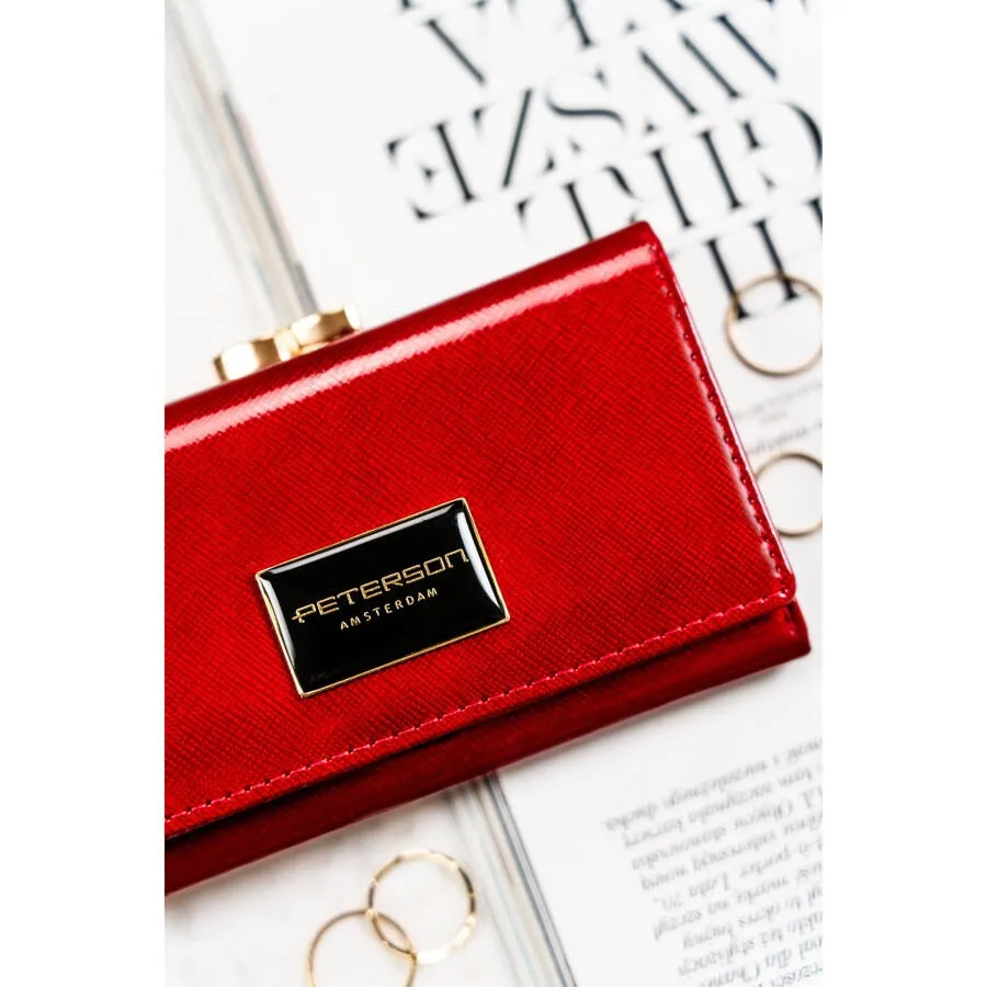 Czerwony portfel damski Peterson ze skóry naturalnej z zabezpieczeniem RFID. Wyposażony w bigiel, liczne przegródki na karty, banknoty i kieszeń na monety. Elegancki, bezpieczny i funkcjonalny – idealny wybór dla nowoczesnych kobiet.