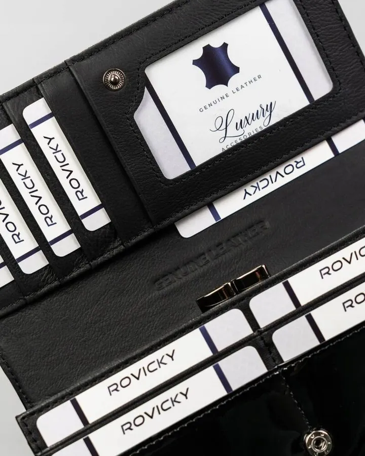 Uszyty z wysokogatunkowej skóry naturalnej z wierzchu pokrytej lakierem. Portfel poziomy zamykany klapką na zatrzask i biglem. Model zaprojektowano niezwykle intuicyjnie i funkcjonalnie. Pomieścisz w nim pokaźne ilości kart, dokumentów oraz gotówki.