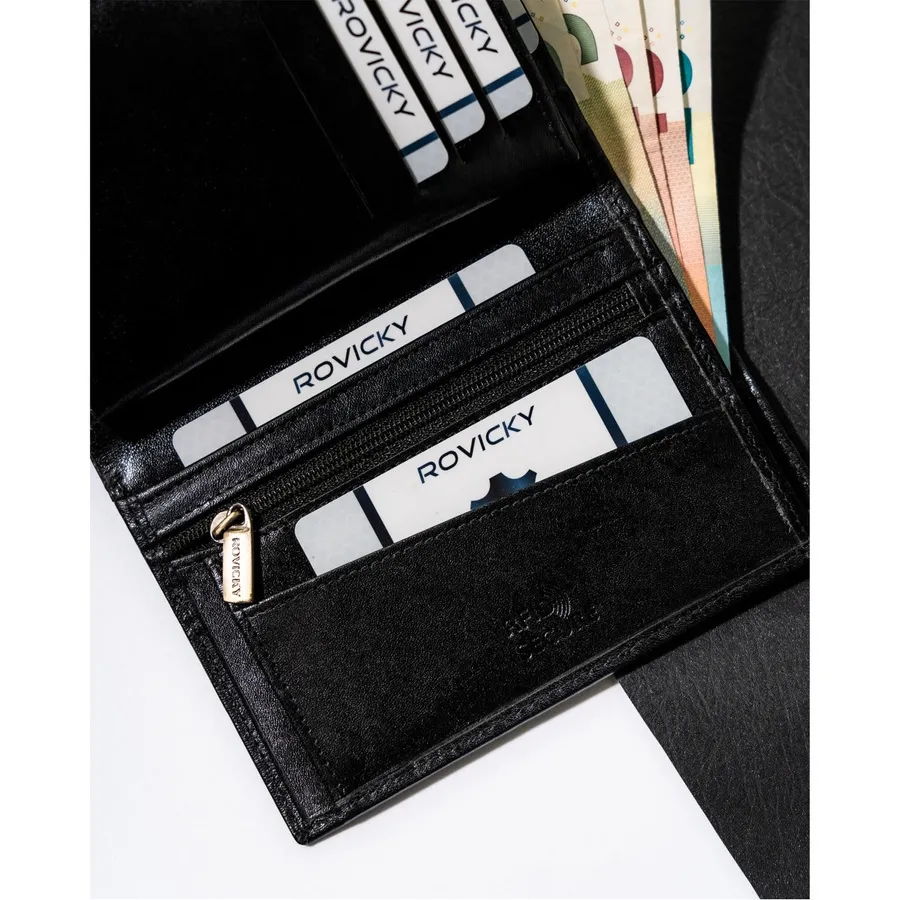 Średniej wielkości, składany portfel męski. Uszyty starannie z dobrej jakości skóry naturalnej cielęcej. Portfel zawiera 8 kieszonek na karty, szeroką kieszeń na banknoty oraz sekcję na monety zamykaną solidnym zatrzaskiem.