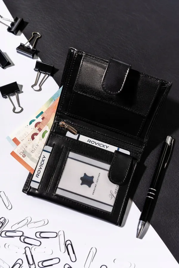 Odszyty bardzo trwale z gładkiej skóry naturalnej. Model w orientacji poziomej bez zapięcia zewnętrznego. Mieści dowód rejestracyjny. Wyposażony w technologię RFID BLOCKING SYSTEM.