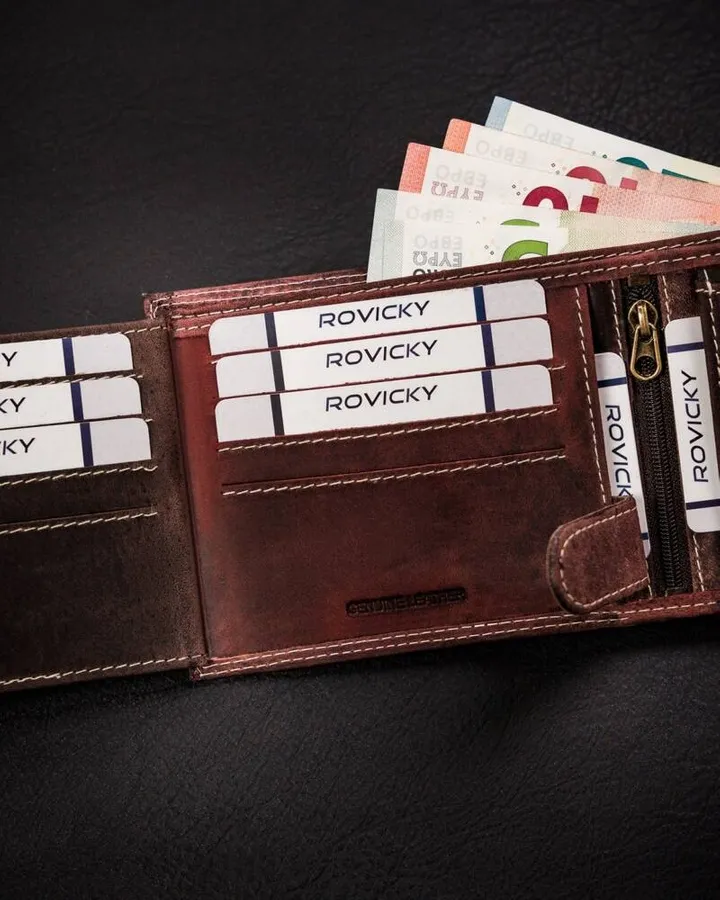 Odszyty bardzo trwale z doskonałej jakości, przyjemnej w dotyku skóry naturalnej nubukowej. Portfel o klasycznej stylistyce. Model w orientacji poziomej zapinany na zatrzask. Portfel mieści dowód rejestracyjny. Wyposażony w technologię RFID.