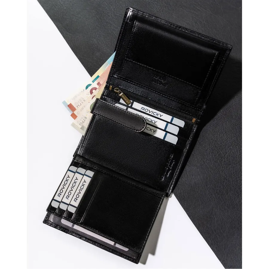 Stylowy, minimalistyczny portfel ze skóry naturalnej w czarnym kolorze. Wyposażony w pojemną sekcję na karty i dokumenty, którą zabezpiecza membrana RFID. Idealny wybór na prezent dla mężczyzny ceniącego klasyczny design.