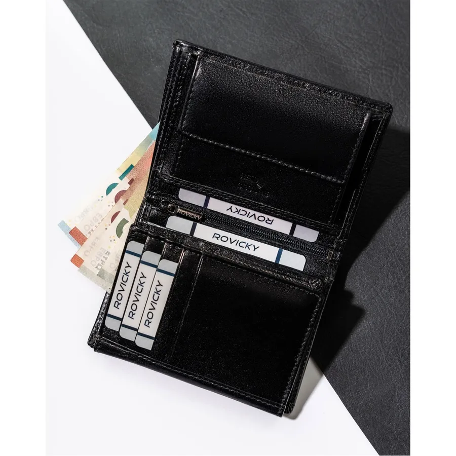 Klasyczny portfel męski Rovicky z naturalnej skóry, zamykany zatrzaskiem. Wyposażony w ochronę RFID, funkcjonalne przegrody na dokumenty, banknoty i monety. Idealny jako praktyczny prezent, gwarantujący styl i bezpieczeństwo.