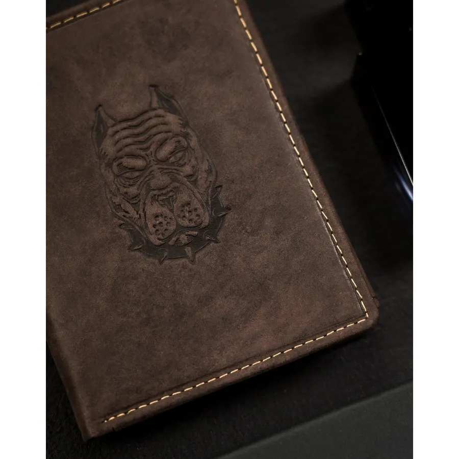 Portfel wykonany został z naturalnej skóry o stylowym, lekko przecieranym wykończeniu. Portfel z tłoczeniem psa – wiernego towarzysza, uosobienie lojalności, czujności i oddania. Wyposażony w system RFID. Portfel bez zapięcia.