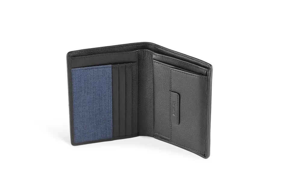 Poziomy portfel męski wykonany z połączenia dwóch materiałów: skóry naturalnej i płótna.