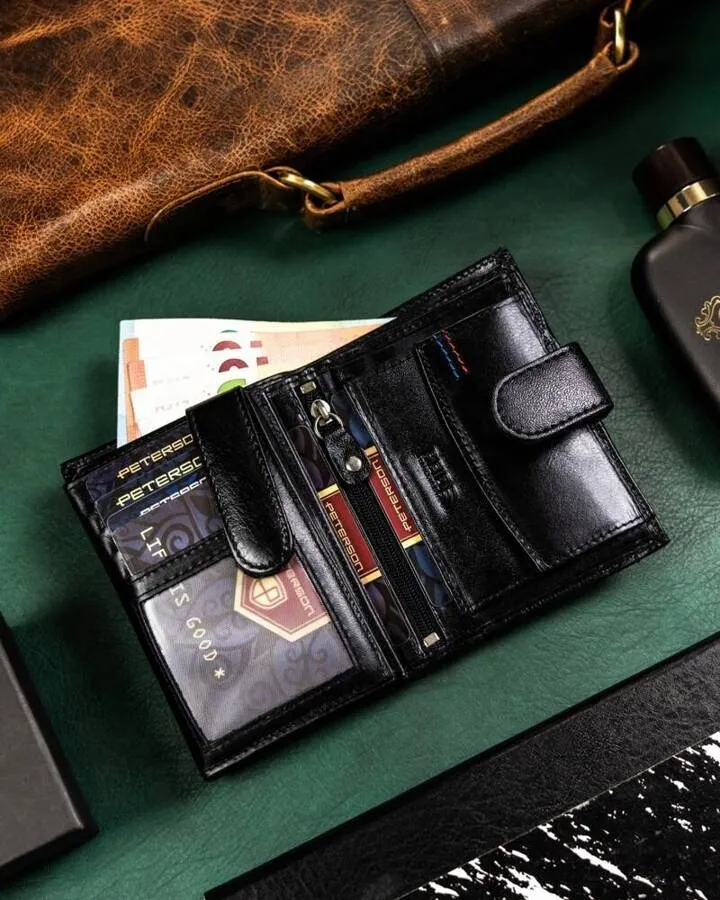 Portfel odszyty z naturalnej skóry w czarnym kolorze. Ma rozbudowane sekcje w bardzo intuicyjny sposób, organizacja wnętrza jest na najwyższym poziomie. Zabezpieczony we wkładkę RFID, która chroni przed niechcianym odczytem danych z karty płatniczej.
