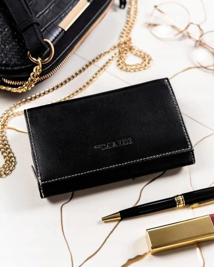 Portfel uszyty z mocnej i trwałej skóry naturalnej bydlęcej, lekko połyskującej, lecz nie lakierowanej. Stylowy portfel o ponadczasowym fasonie z pięknym kolorowym środkiem. Wyposażony w technologię RFID i 9 przegródek na karty.