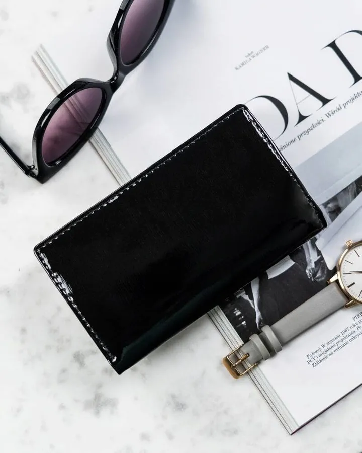 Uszyty z wysokogatunkowej skóry naturalnej z wierzchu pokrytej lakierem. Portfel poziomy zamykany klapką na zatrzask. Model zaprojektowano niezwykle intuicyjnie i funkcjonalnie. Pomieścisz w nim pokaźne ilości kart, dokumentów oraz gotówki.