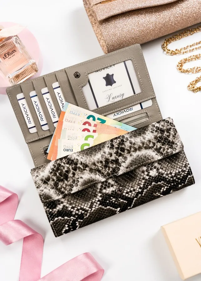 Uszyty z wysokogatunkowej skóry naturalnej z wierzchu pokrytej lakierem. Portfel zamykany klapką na zatrzask. Front zdobi logo marki. Model zaprojektowano intuicyjnie i funkcjonalnie. Pomieścisz w nim pokaźne ilości kart, dokumentów oraz gotówki.