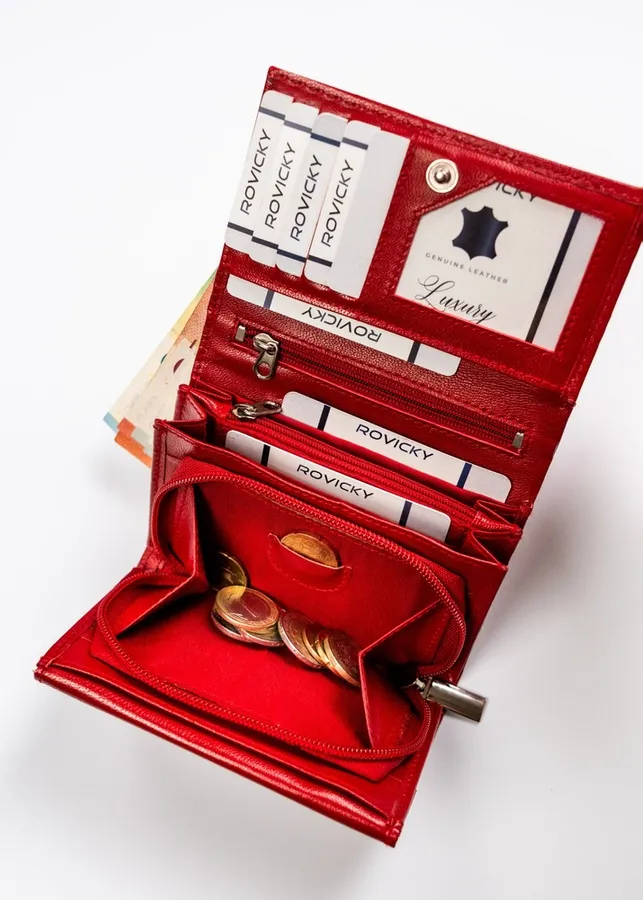 Wykonany z wysokogatunkowej skóry naturalnej. Skóra portfela po stronie zewnętrznej jest lakierowana, pięknie się mieni i ozdobiona została tłoczeniem imitującym listki. Środek wyposażone w szereg przegródek, w których karty i dokumenty znajdą miejsce.