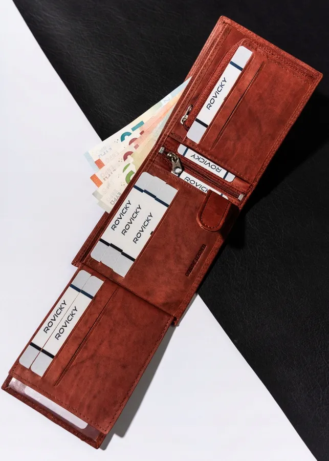 Portfel został starannie odszyty z wysokiej jakości skóry naturalnej. Elegancki kształt, który z pewnością sprosta oczekiwaniom zarówno miłośników klasyki, jak i nowoczesnych rozwiązań. Środek portfela zawiera liczne przegródki i kieszonki.