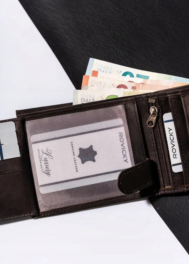 Portfel został starannie odszyty z wysokiej jakości skóry naturalnej. Elegancki kształt, który z pewnością sprosta oczekiwaniom zarówno miłośników klasyki, jak i nowoczesnych rozwiązań. Środek portfela zawiera liczne przegródki i kieszonki.