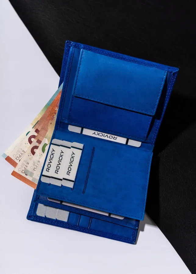 Portfel został starannie odszyty z wysokiej jakości skóry naturalnej. Elegancki kształt, który z pewnością sprosta oczekiwaniom zarówno miłośników klasyki, jak i nowoczesnych rozwiązań. Środek portfela zawiera liczne przegródki i kieszonki.