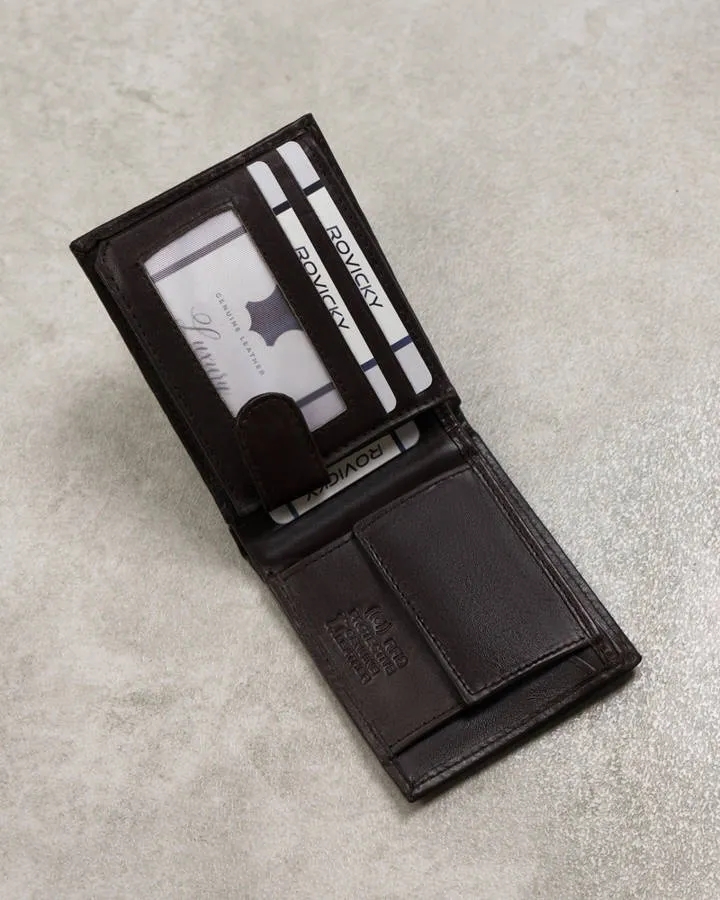 Skórzany portfel bez zewnętrznego zapięcia. Wyposażony w wygodne zakładki na karty i kieszenie na dokumenty. W centrum portfela praktyczny schowek na suwak. Na gotówkę przeznaczono dwie kieszenie na banknoty oraz zamykaną zatrzaskiem przegródkę na bilon.