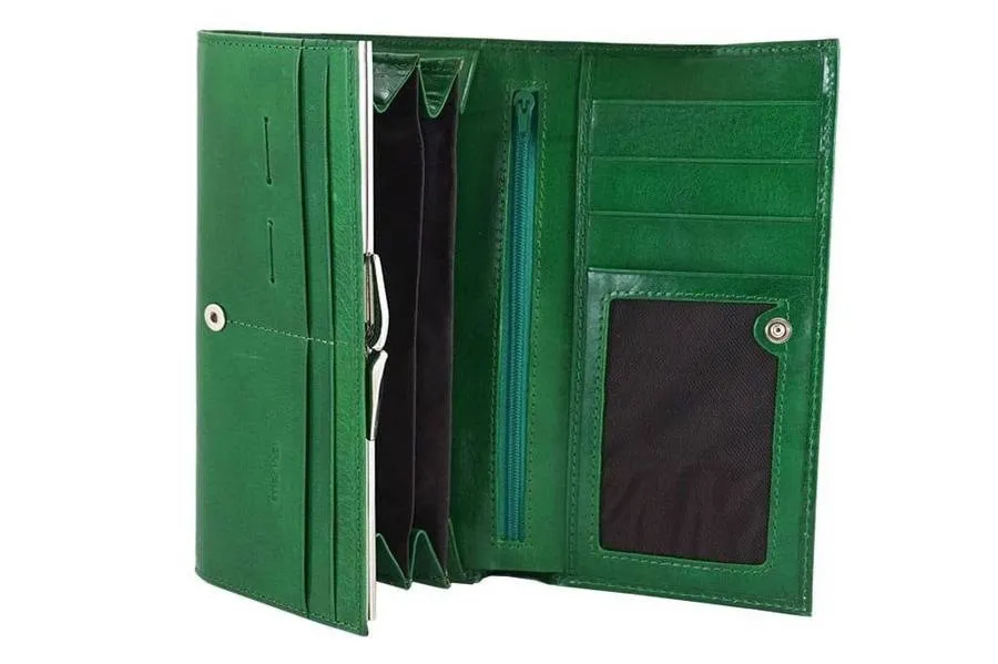 Wnętrze portfela: w części zasuwanej znajdują się dwie przegrody na banknoty oraz zasuwana kieszeń na monety. W części zapinanej na zatrzask wyodrębniono 17 miejsc na karty płatnicze lub lojalnościowe, dwie przegrody na banknoty, notatki lub listę zakupów, miejsce na fotografię oraz dokument ze zdjęciem.