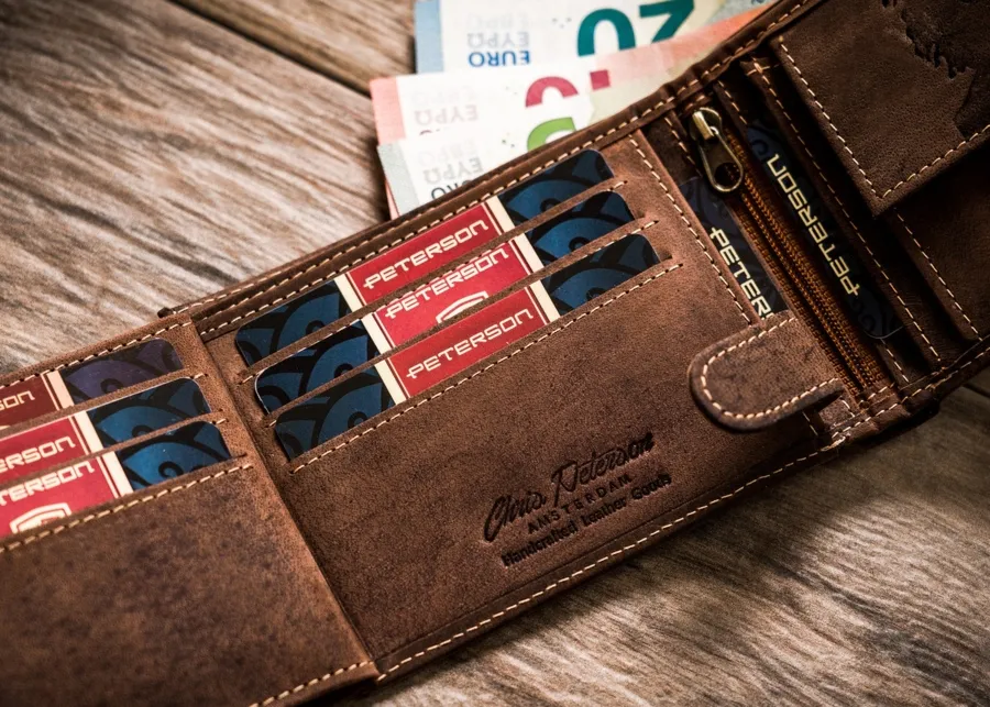 Duży portfel ze skóry naturalnej. Pomieści pokaźne ilości kart oraz gotówki.Wyposażony w technologię RFID, która zabezpiecza karty zbliżeniowe, dokumenty biometryczne, legitymacje i karty komunikacji miejskiej przed nieautoryzowanym odczytem danych.