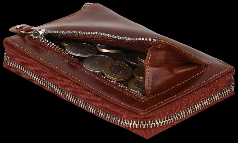 Poziomy portfel bez zewnętrznego zapięcia. Wykonany z gładkiej skóry naturalnej dobrej jakości. Zdobiony tłoczeniem z monogramem marki. Wewnątrz duża sekcja na dokumenty mieszcząca dowód rejestracyjny, kieszeń na banknoty i kieszonka na bilon.