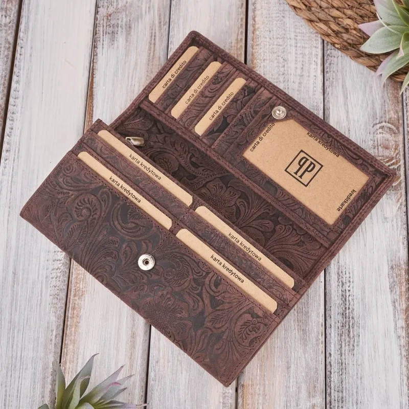 Duży portfel damski z postarzanej skóry naturalnej w kolorze granatowym, orientacja pozioma. Wewnątrz dwie przegrody na banknoty, kieszeń na bilon oraz 20 przegródek na karty kredytowe. Dodatkowo kieszeń na suwak na tyle portfela i dwa schowki, w tym jeden transparentny. Wewnątrz warstwa ochronna RFID, zapobiegająca kradzieży danych. Idealny prezent dla kobiety w każdym wieku, która poszukuje pakownego portfela. CharakterystykaProducent: Paolo PeruzziModel: T-25-BLMateriał: skóra naturalna z efektem postarzeniaWzór: roślinny Kolor: czarnyOrientacja: poziomaIlość przegródek na karty: 20Ilość schowków: 2 (w tym jeden transparentny)Przegroda na banknoty: 2Kieszeń na bilon: tak, na suwakWarstwa ochronna RFID: takPudełko prezentowe: tak WymiaryWysokość: 10 cmSzerokość: 20 cmGrubość: ok. 3 cm