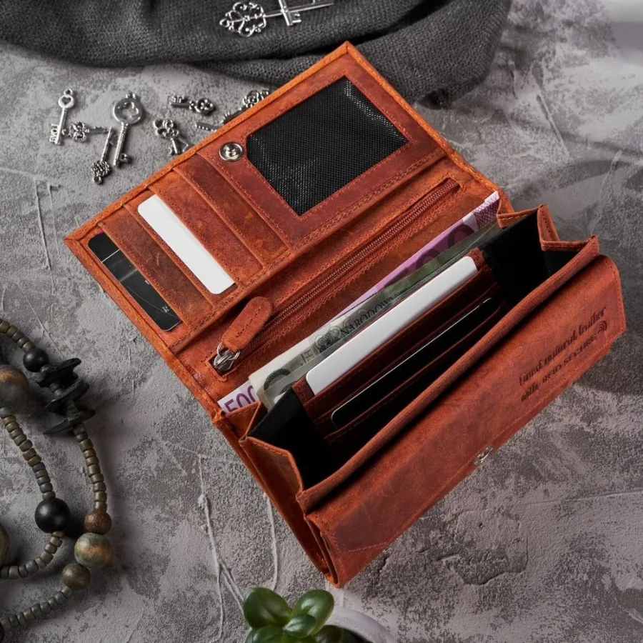 Mały portfel damski z klapą na zatrzask. Wykonany z wysokojakościowej skóry naturalnej. Wewnątrz zakładki na karty, klasyczne przegrody na gotówkę oraz miejsce na dowód rejestracyjny. Portfel z systemem antyskimmingowym, zapakowany w markowe pudełko.