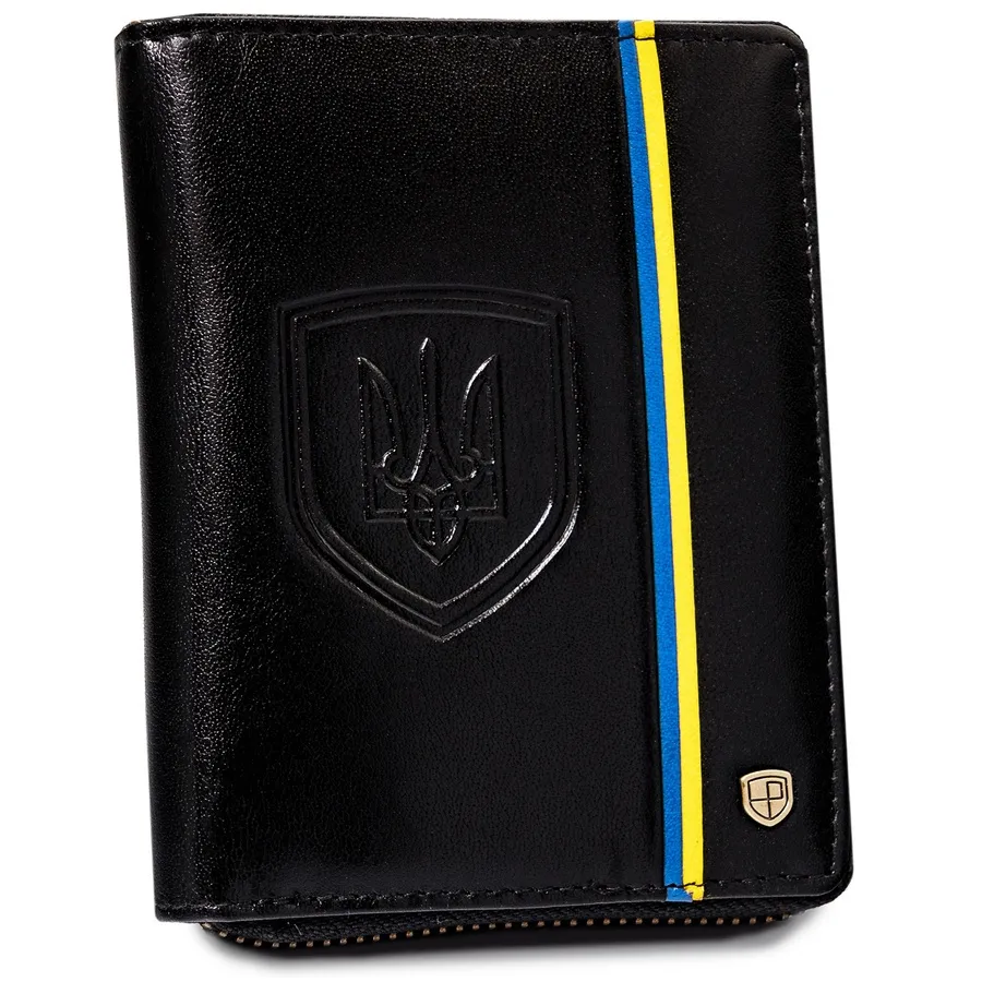 Zgrabny portfel męski z nubukowej skóry naturalnej. Zdobiony patriotycznym motywem z godłem Ukrainy. Składany, bez zapięcia. Wewnątrz pojemna sekcja na karty i dokumenty oraz przegródki na gotówkę. Akcesorium z systemem RFID Protect.