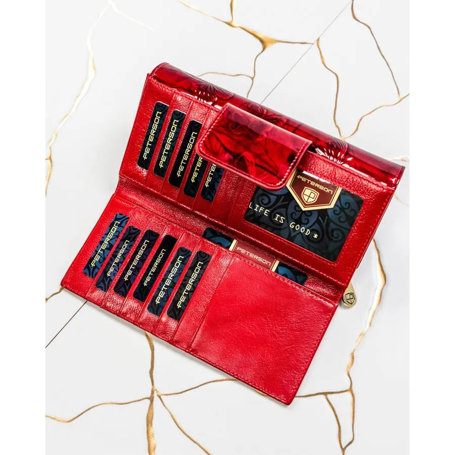 Lakierowany portfel damski Peterson z naturalnej skóry, wyposażony w ochronę RFID. Elegancka portmonetka na bigiel z licznymi przegródkami na karty, banknoty i monety. Idealne połączenie stylu, bezpieczeństwa i funkcjonalności dla nowoczesnych kobiet.