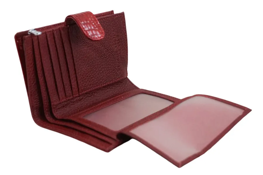 Portfel damski w orientacji poziomej zamykany na zatrzask. Wykonany ze skóry naturalnej. Portfel mieści dowód rejestracyjny i jest wyposażony w system RFID. Sekcja na bilon zamykana zatrzaskiem. Akcesorium zapakowane w firmowe pudełko.