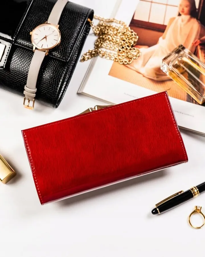 Uszyty z lakierowanej skóry naturalnej. Na zewnątrz ma gładką fakturę, w środku jej powierzchnia jest matowa i żyłowana. Portfel o klasycznym fasonie. Model w orientacji poziomej, zapinany bezpiecznym i trwałym zatrzaskiem. Wyposażony w technologię RFID.